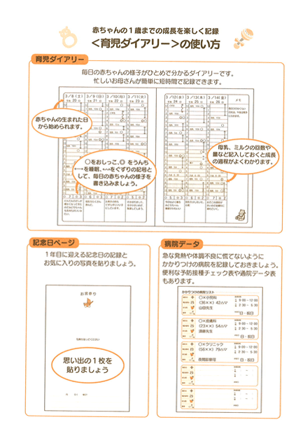 サイズ:H215×W160×D15mm A5 素材:カバー;PVC製(ペンホルダー付) 内容:176ページ 誕生日の記録ページ,いただいたものリスト,アルバムページ, かかりつけの病院リスト,予防接種リスト,通院記録ページ, ダイアリーページ,メモページ赤ちゃんの1歳までの成長記録をつけられるダイアリー ビニールカバー付きで、汚れや水もしっかり防いでくれます。