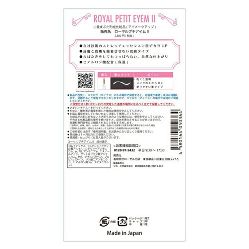商品詳細 商品名 ローヤルプチアイムII (ROYAL PUTIT EYEM II) 内容量 (約)4mL 商品サイズ (約)90 mm × 40 mm × 170 mm 成分 ゴムラテックス、(スチレン/アクリル酸アルキル)コポリマーアンモニウム、水、PG、アンモニア水、エタノールアミン、グリチルリチン酸アンモニウム、PVP、メチルパラベン、プロピルパラベン、リン酸ニアンモニウム、ヒアルロン酸Na、クオタニウム-73 セット内容 本体(4mL)、専用スティック1本 商品説明 大人気ローヤルプチアイムが、瓶に生まれ変わって新登場。
